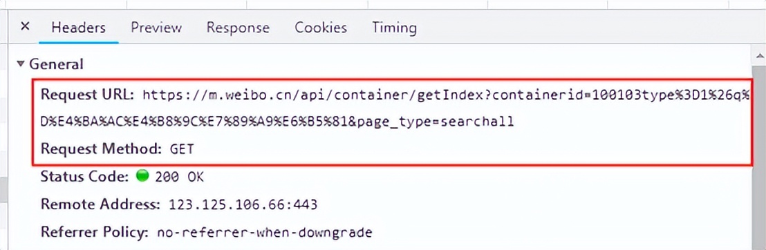 请求地址、请求方式和参数列表可以根据Chrome开发人员工具中的网络请求Header信息获取,请求信息如下图所示: