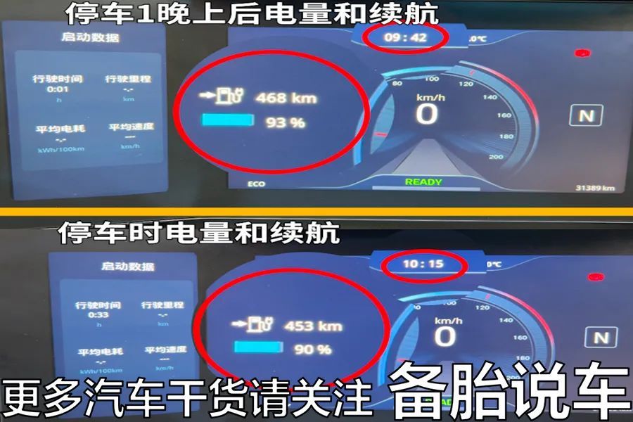 我们找了一台已经开了31389km的电动车,直接停一个晚上,电量基本上就是没掉,续航里程也没怎么变。