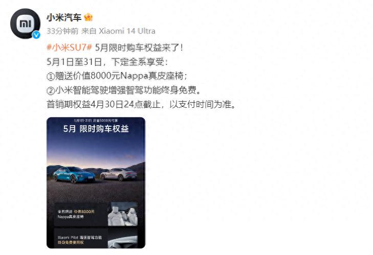 【大河财立方消息】小米汽车微博称:5月1日至31日,下定全系享受: ①赠送价值8000元全粒面Nappa真皮座椅; ②小米智能驾驶增强智驾功能终身免费。 首销期权益4月30日24点截止,以支付时间为准。
