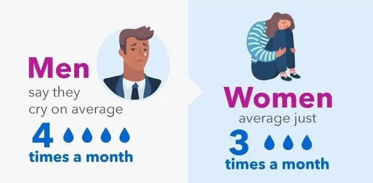 一项由国际市场调研公司(OnePoll)代表医疗健康平台(Vida Health)随机对2,004名成年人进行的调查发现,男性比女性哭的频率要更高,男性每年哭48次,而女性每年哭36次。[2]