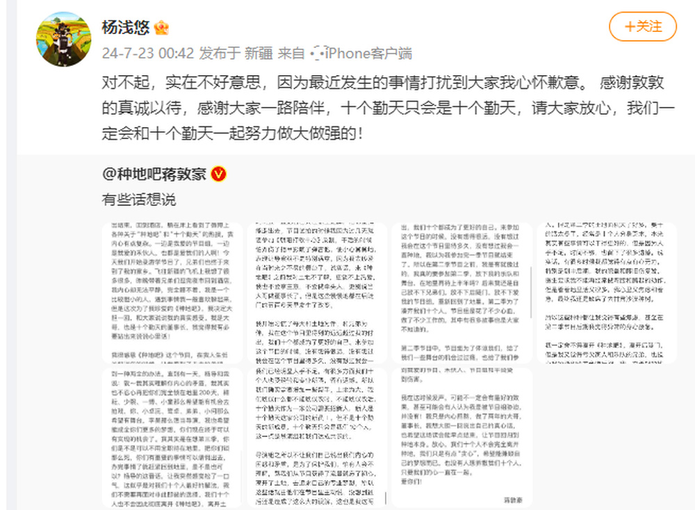 23日凌晨, 《种地吧》导演也转发该长文,并表达了歉意:“对不起,实在不好意思,因为最近发生的事情打扰到大家我心怀歉意。 感谢敦敦的真诚以待,感谢大家一路陪伴,十个勤天只会是十个勤天,请大家放心,我们一定会和十个勤天一起努力做大做强的!”