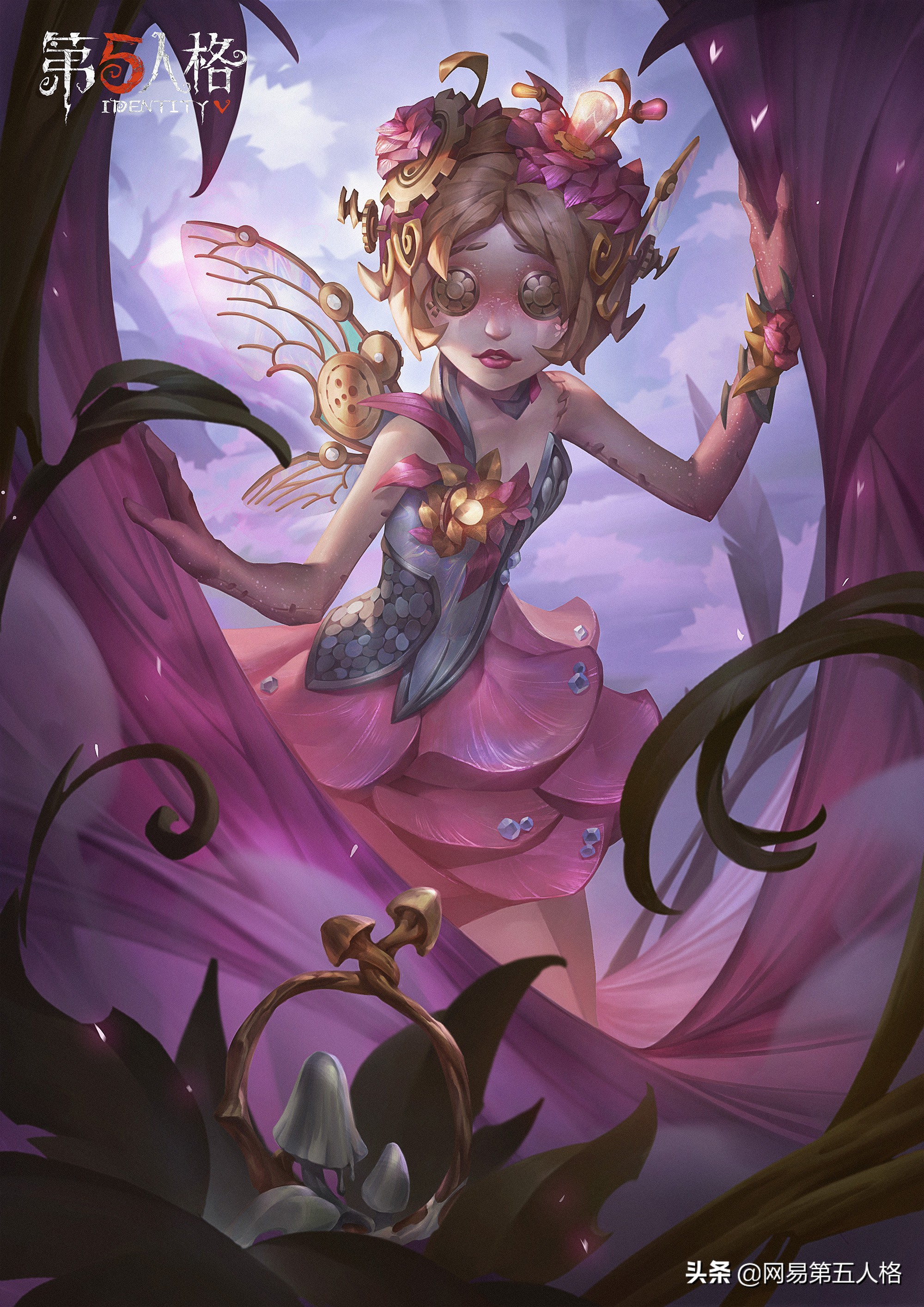 机械师-永不枯萎的花用金属为自己打造了花仙子裙,衣服是青绿色的花萼,裙摆是粉红色的花瓣,花瓣上还有露珠在颤动,仿佛刚刚接受了晨间的清新空气的滋养;头上、手上和脚上戴着金属编织的花环和花饰,齿轮、灯泡、弹簧等机械元素则暗示着它们的永恒;身后是一对半透明的金属翅膀,如同一位巡视花丛的花仙子一般,双翅一震便能轻盈飞起;她的身旁有着若隐若现的粉色蝶影,闪闪荧光在身上亮起,唯美而浪漫。