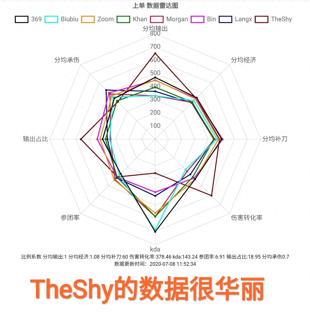 首先我们先来看一下上单位置雷达图,六芒星数据最能够直观的考察一个职业选手的个人能力,在分均输出,伤害转化率和分均伤害上,我们看到棕色的theshy直接凸了出来,可能最近一段时间很多的玩家,对于theshy的质疑声非常大,但是通过这个图片,能够最好的表现出来,他依旧是目前来看lpl赛区最强的一名上单选手,而tes战队的上单选手369,虽然排在他的后面,但是和TheShy的差距还是非常大的。