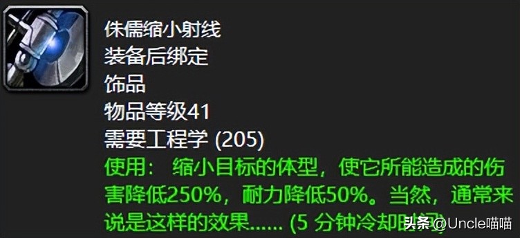 最强秒人神器侏儒缩小射线,真的是非常好用的存在,喵叔基本常驻野外打架饰品,而且五分钟的冷却CD来说足够你一直使用了。只需要205点工程学就可以打卡的它真真是不能错过的准神器,必肝。