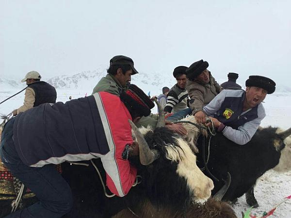 地处巍峨雪山脚下的麻扎种羊场里,一群塔吉克族男青年骑牛纵情驰骋、激烈拼抢,他们正在参加传统体育竞技项目——牦牛叼羊。平坦的雪场一望无际,身披厚厚绒毛、憨态可掬的牦牛们蓄势待发。随着裁判员一声令下,听着主人呼唤的指令,“萌牛”瞬间变身猛牛,朝着“猎物”迎头而上。与骑马叼羊相比,牦牛脾气倔强、性情暴烈。参赛选手克力木阿洪说,牦牛奔跑的速度慢于马,需要更多指令调动牦牛的情绪,冲上去抢羊,最终把羊放进提前挖好的坑里,才算胜利。选手们在观众们