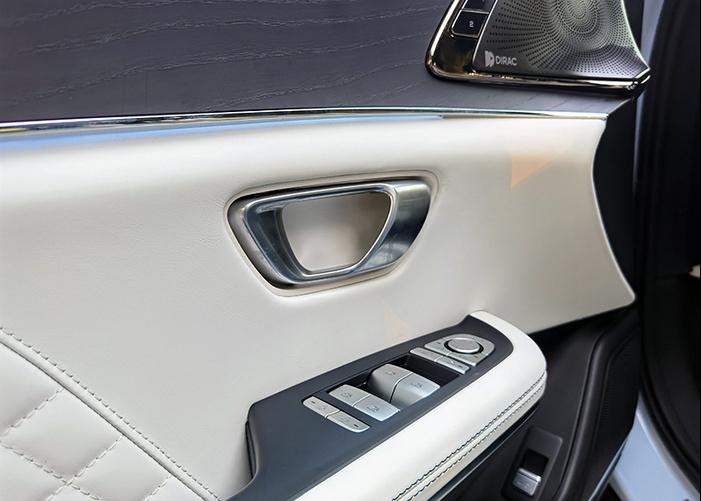 浅内饰这套配色方案,让汉EV整个内饰层次感更丰富一些。中控部分的上深下浅搭配,也使得原来在深色内饰中不太显眼的装饰细节突显了出来,到了光线稍暗的时候中控上的蓝色菱格纹就显出来了,就是这样的一些点缀,我觉得让中控的视觉效果相比深内饰那套有很大的不同感。另外,车门内侧换了浅色,也显出了镀铬条,看上去层次更丰富,同时也显得更精致一些。
