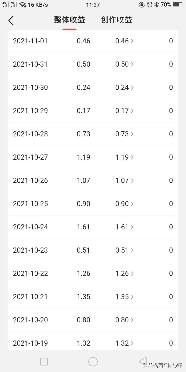 一直到去年十月份,工作忙碌,头条问答也做着,收入已经大不如前,从原先的每天二百左右成了后来的每周一百多。直到上月末,头条问答的收入跌落成每天几元钱。