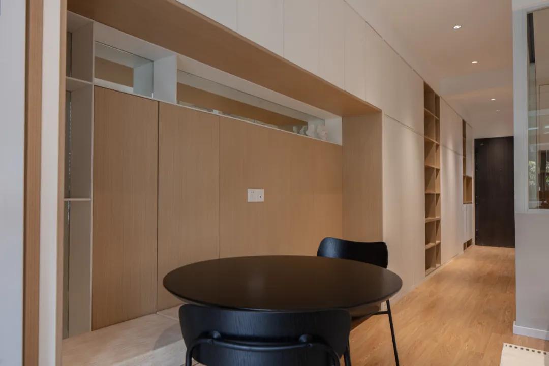 空间小,更需要“物尽其用”。电视墙并不局限于一种功能,我们利用组合柜增加了餐厅,摆上餐桌椅,就能满足一家人围桌而坐的用餐需求。