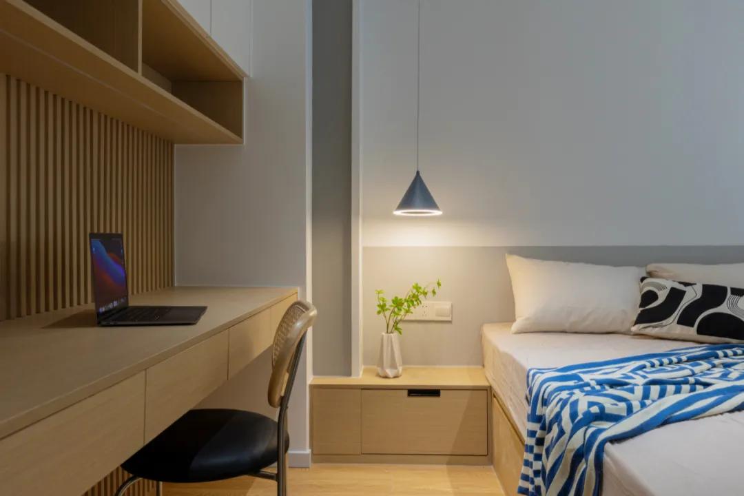 1500mm的榻榻米代替双人床,底部为收纳抽屉一直连接床头。靠墙设置书柜+书桌,长度达1830mm,因为刚好是在房梁之下,书柜也有修饰梁体的功能。