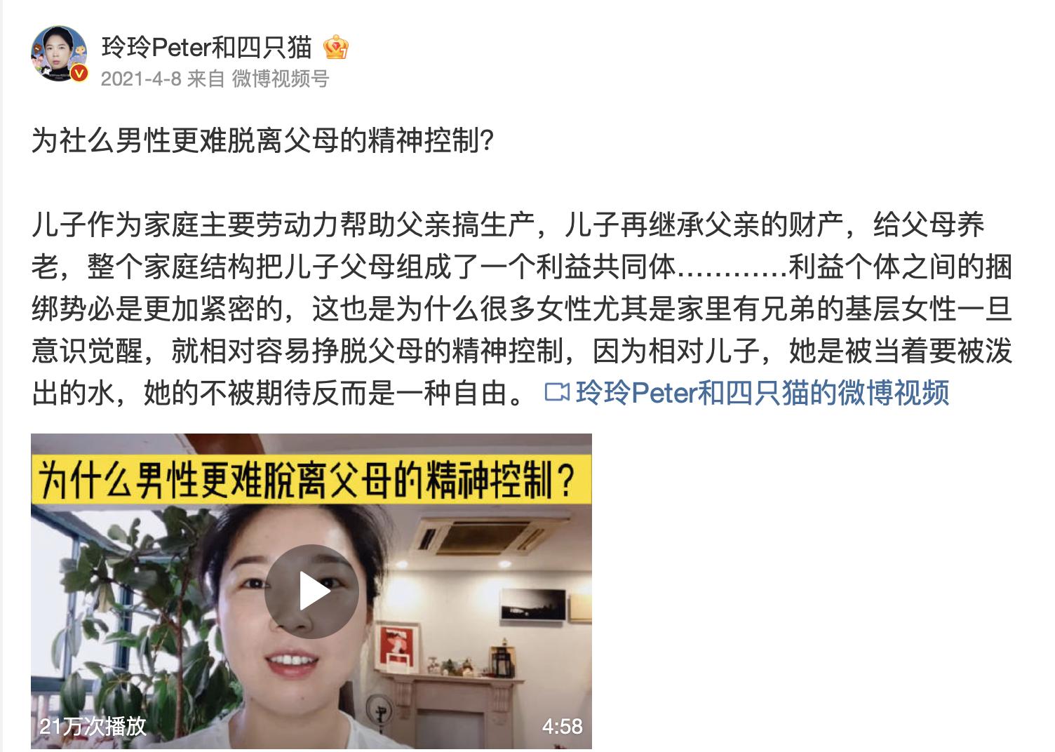 在此背景下,博主“玲玲Peter和四只猫”在社交平台的走红以及她的作品《基层女性》的畅销具有比较重要的意义。博主“玲玲Peter和四只猫”本名王慧玲,性别女,出生于安徽农村一个重男轻女的家庭,中专学历,19岁时来到上海独自打拼,并逐渐走向经济独立、精神独立。2020年3月,王慧玲因为一条讲述基层女性婚姻困境的短视频爆火,从此常驻新浪热搜。此后,她以基层女性为讲述对象,在视频中表达自己的婚恋观点,引发了热烈的关注和讨论。这个出身基层,又具有一定知识阅历的博主,为在苦苦挣扎的基层农村女性带来了生存指导和情感关怀,也把她们带入到了网络性别话题讨论中。