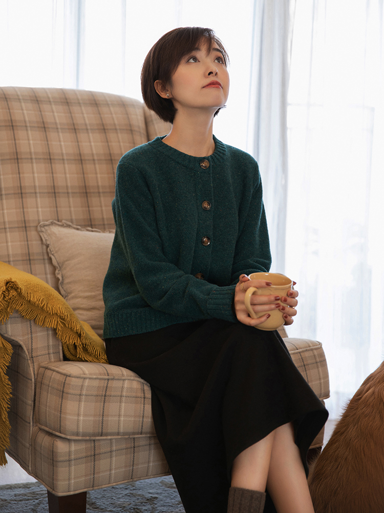 我们还可以选择同色的搭配技巧,选择不同的衣服单品来搭配,依然很高级显贵,上面这套也是绿色针织开衫+黑色半身裙,结合短靴漂亮大方,这样的秋冬复古圆领短款羊毛衫,值得大家入手一件不嫌多,上面时候穿搭都适合。
