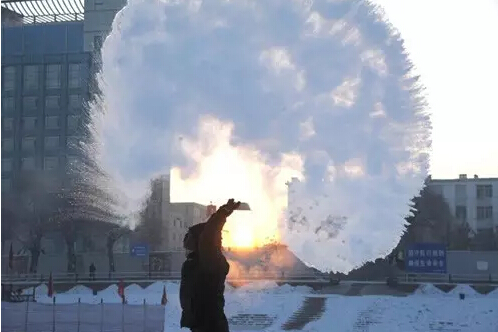 1月21日,哈尔滨一名市民向空中泼洒热水,泼出的水立刻凝成冰凌。冰城哈尔滨迎来一年中最冷的季节,室外温度已经降到零下30多摄氏度,用盆装满热水向空中一泼迅速就会结成冰凌。图片:新华网
