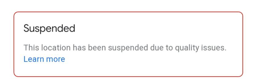 然后,他们将在网上进行快速搜索,可能根本找不到他们的清单,或者他们将登录到“ Google我的商家”信息中心,并看到一条通知,提醒他们其清单已被暂停: