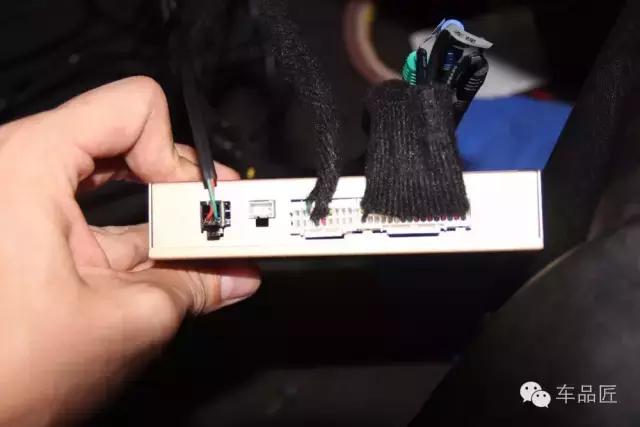 18.将gps定位器装在副驾驶前方挡风玻璃底部,线路沿着密封条凹槽塞入,将插头连接到导航主机对应的插口上。将所有设备的插头插到中控台对应的插口中。