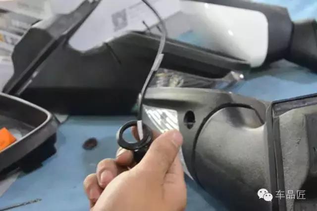 12.左右影像的摄像头安装在后视镜下方,需要把后视镜拆下。拆开后视镜注意镜面连接着的电线需拔掉后才能放下,镜面放置到不易触碰到的地方,以免摔破。