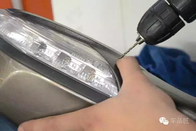 14.确定好安装位置之后,先用小钻头的电钻在后视镜下方钻孔。