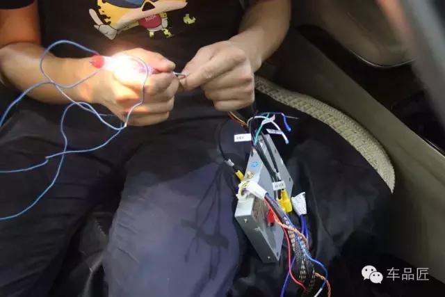 17.打开转向灯,用小刀片切开电线表皮测电,测电笔发光后将转向灯关闭,将左右摄像头电源线与对应方向的转向灯电线连接。(后视摄像头连接方法也一样,与倒车灯相连)