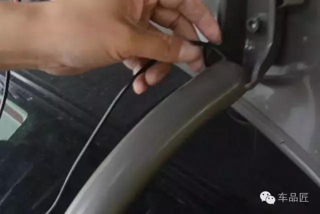 10.后视线路沿着后排门框密封条凹槽安装,将线路塞进凹槽缝隙中,如果遇到缝隙较小的地方,可以将电线捆在一根细细的金属条上方便排线。