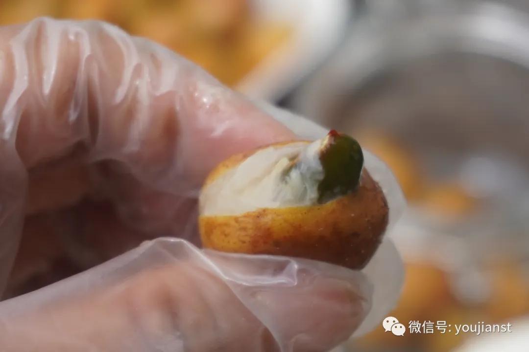 蒸好的黄皮取出来晾干,挤出果核;