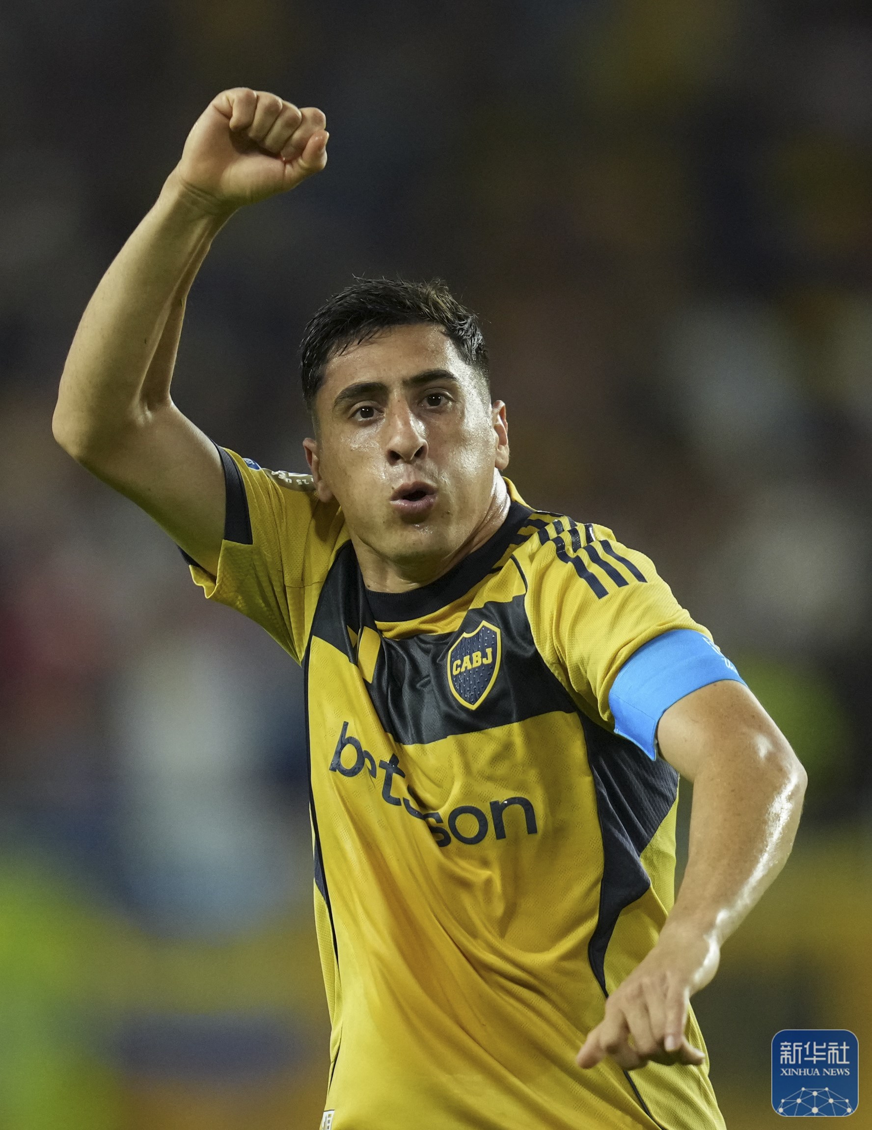 ↑ 博卡青年队球员梅伦铁尔进球后庆祝。新华社记者 李明 摄