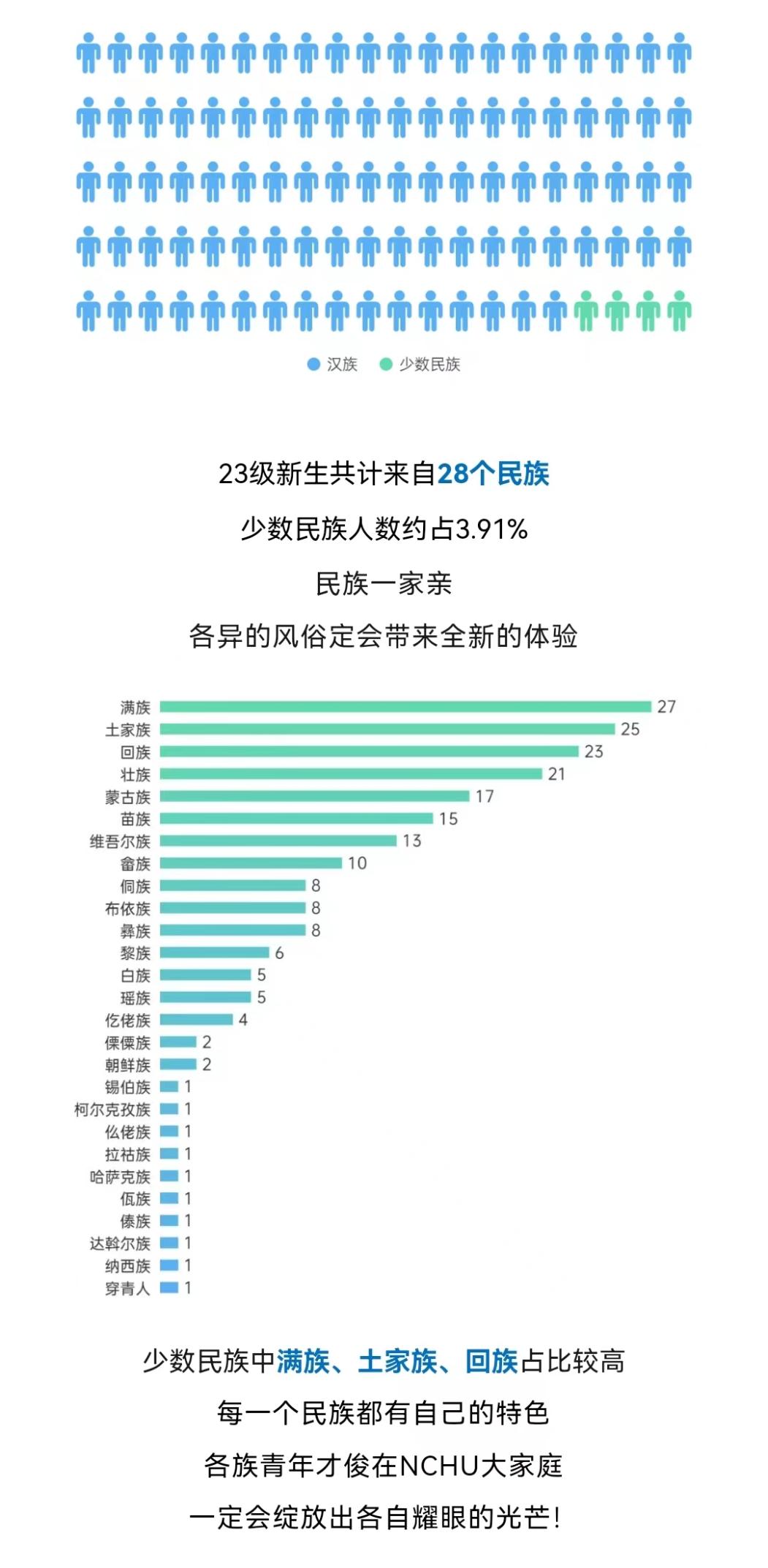 5345位萌新们来自28个民族,少数民族中满族、土家族、回族占比较高。
