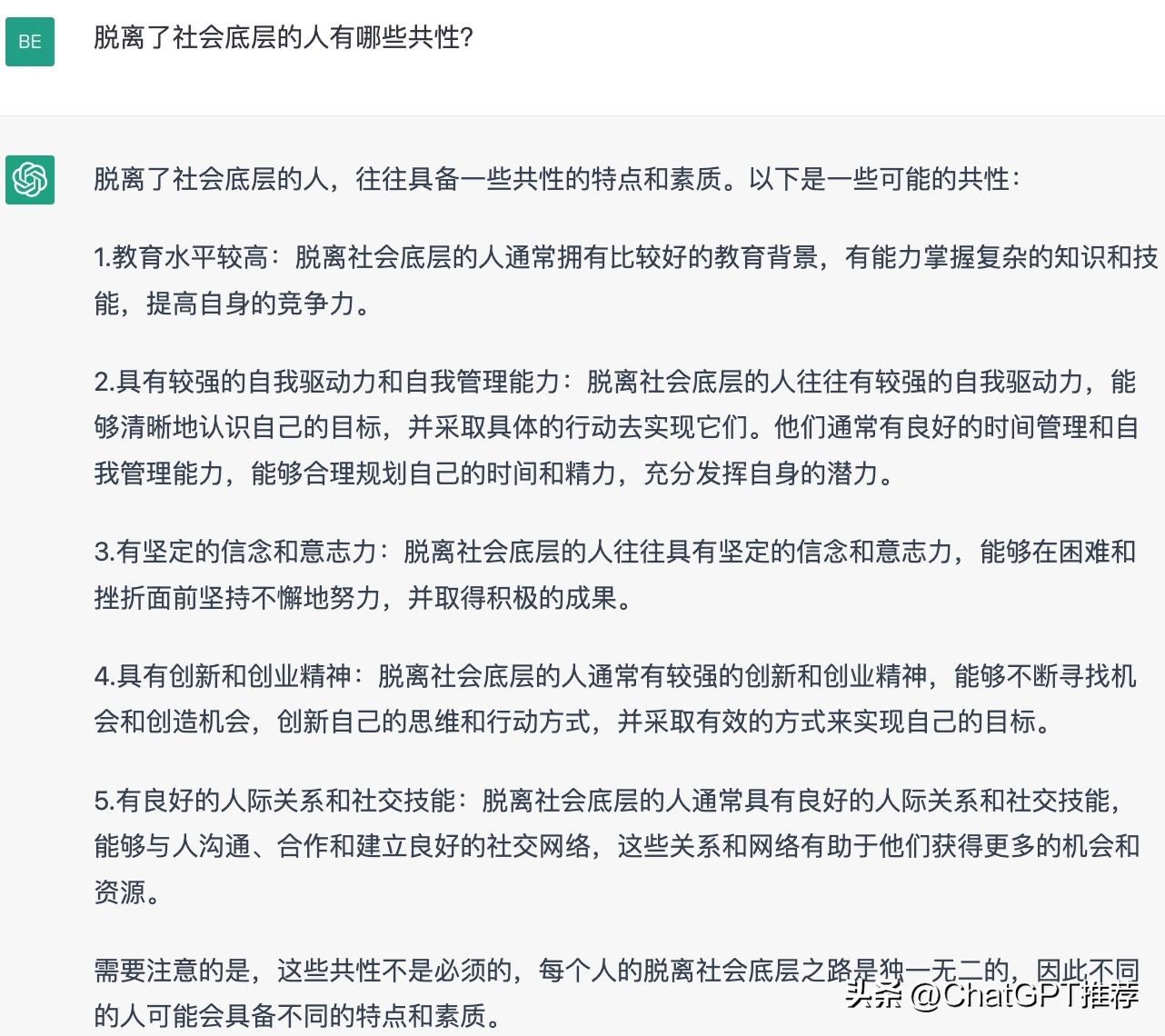 需要注意的是,这些共性不是必须的,每个人的脱离社会底层之路是独一无二的,因此不同的人可能会具备不同的特点和素质。