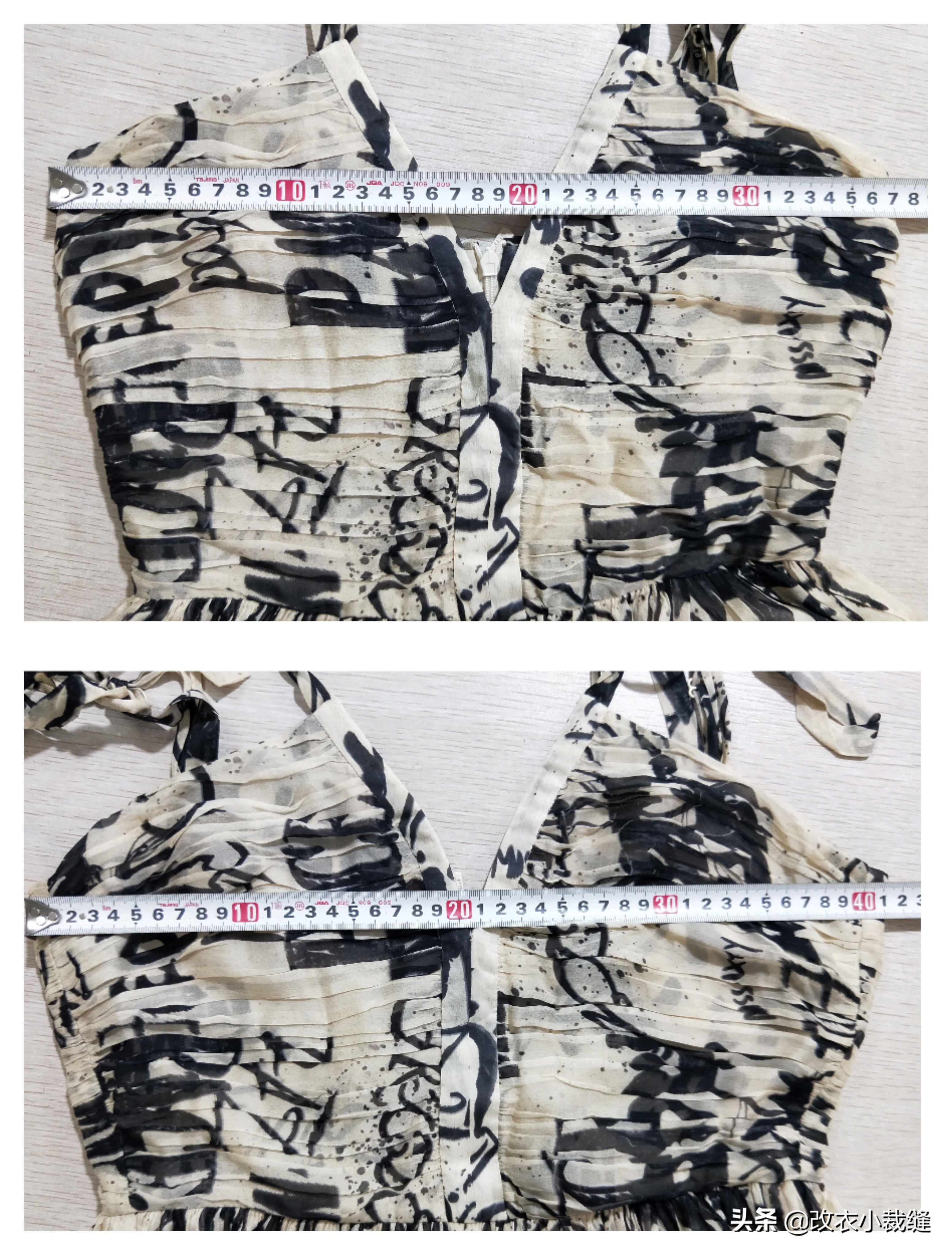 再看下图这件印花连衣裙,胸围尺寸小了很多。尺寸小就是意味着布料量不够。而大尺寸的差异是无法通过放省位、缝位这些方法来解决的。所以,我仍然是选择改窄一些裙摆的宽度来拼大胸围处的布料量