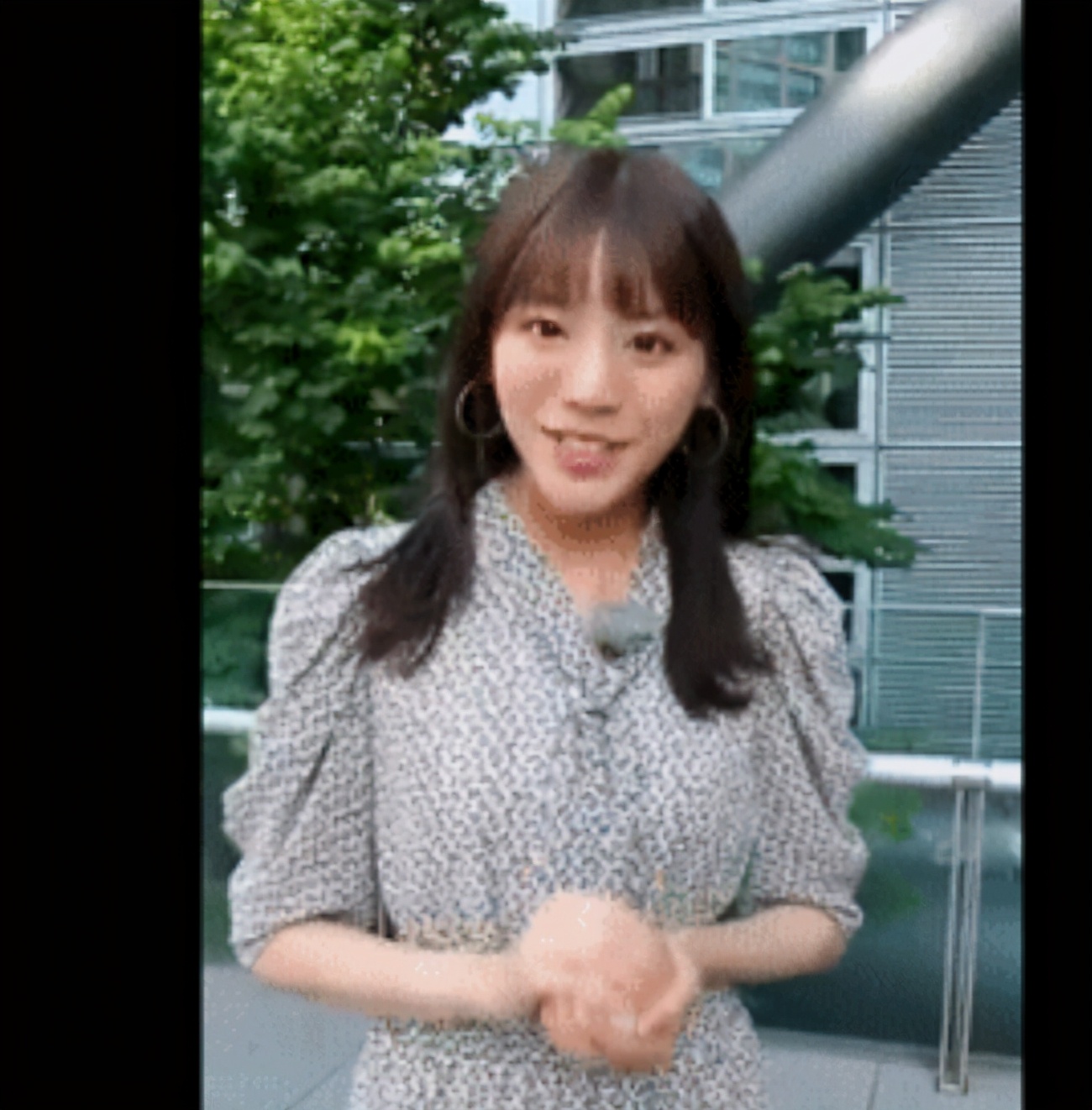 明日香除了展现自己标准的甜美笑容和清晰发音外,她还额外增加了一些的肢体语言和有些夸张的表情。