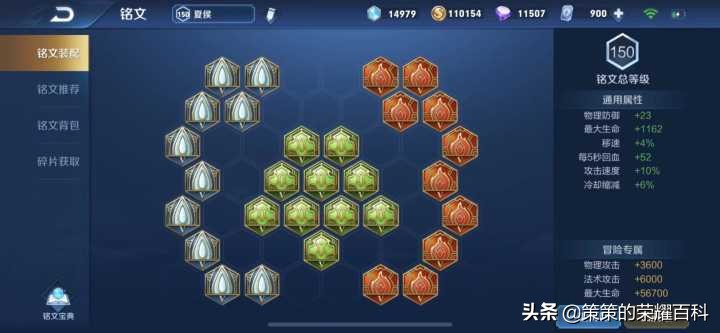 夏侯惇走边是在传统坦克铭文基础上搭配5调和5狩猎,将绿色10虚空换为10鹰眼,以提升对线期的输出能力。