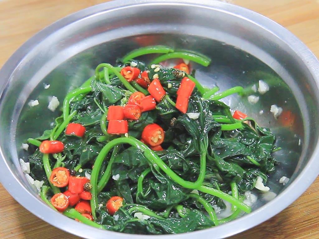 4.起锅烧油,油烧热以后放入小米椒圈翻炒出香味,然后把热油和小米椒一起浇在红薯叶上面,再次拌匀即可装盘食用。