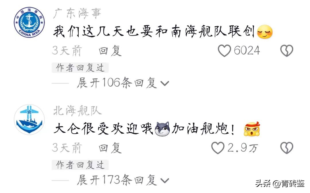 就连“央视军事”“北海舰队”等官方账号也纷纷响应这个热梗。