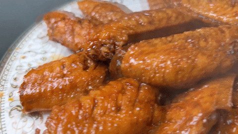 12. 砂锅内的汤汁,大火烧开收汁,然后将汤汁淋在鸡翅上