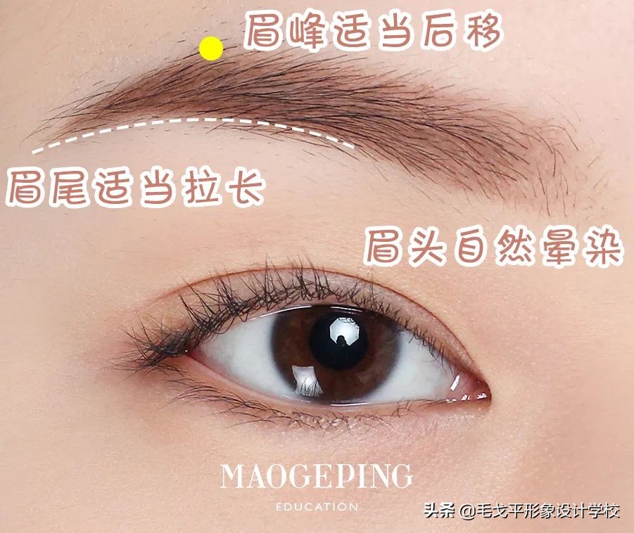 眉尾适当拉长,注意是适当,千万不要一个劲地把眉毛往长了画。你可以把眉峰适当往后调整,眉头用浅色自然晕染,效果更自然。