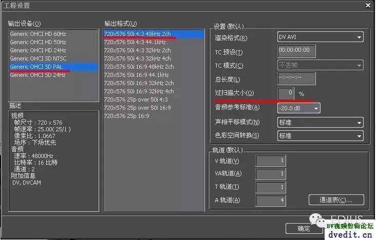 1.新建工程设置 无卡选择SD PAL---720x576 50i 4:3 48kHz 2ch 渲染格式 DV AVI 过扫描方式:0%(转场当中