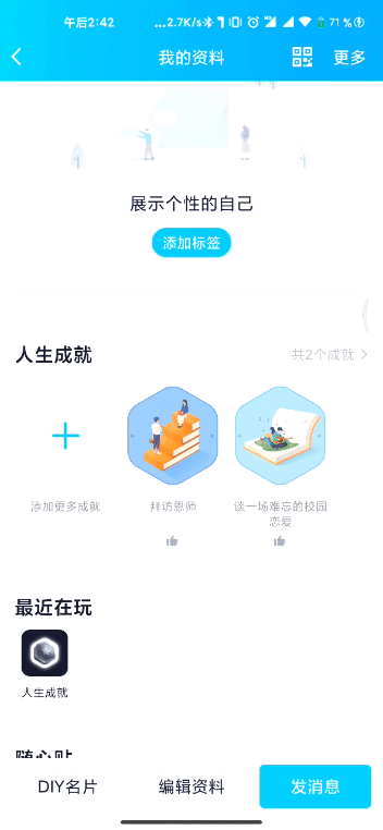 QQ的个人资料页现在多了“人生成就”功能,点进去就能看到朋友设置的人生成就了。