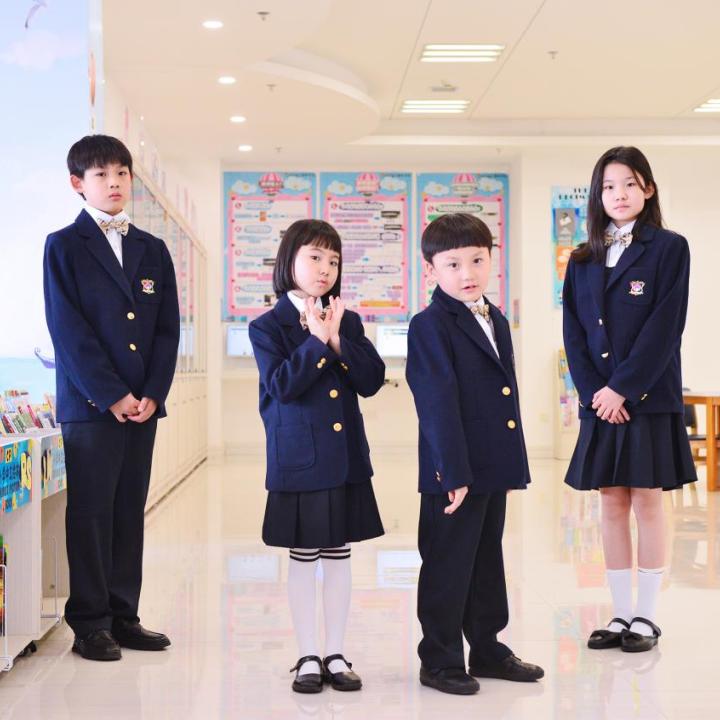 礼服为藏蓝色,大气沉稳,如天空般静谧却又能包罗万象,搭配纯洁的白色衬衣,红蓝相间的领结,映衬着孩子们纯真的笑容、清澈的眼眸。运动装以蓝白为主色调,采用蓝白大面积拼接撞色,针织领、袖口、下摆统一流畅线条分格,将运动与现代化校园风相融合,展现少年儿童积极向上,朝气蓬勃的精神风貌。