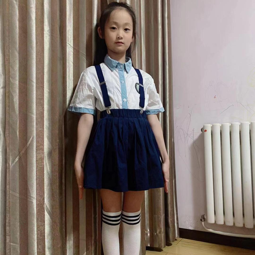 夏季校服蓝白搭配,希望五味学子拥有纯真、善良、谦逊、智慧的美好品质。短袖和百褶裙(短裙)相搭配、花色领结和背带的点缀使设计简洁而又不失活力。