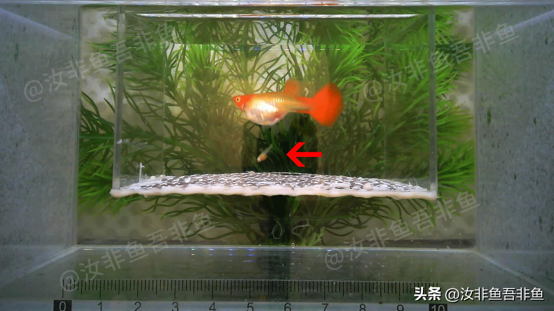 1、发现孔雀鱼有生产迹象后将其放入生产隔离盒。待产期间母孔雀鱼有时会表现得比较安静,有时又会表现非常急躁,在隔离盒内不停地游动。