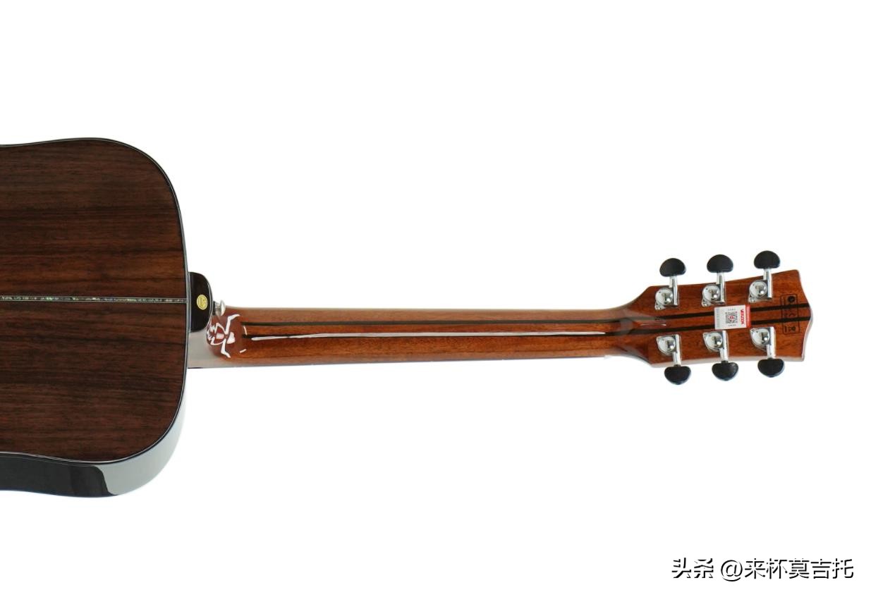3、桃花芯五拼琴颈,桃花心木是一种坚硬的木材,材质性能稳定,一般用于中高端吉他的琴颈制作,五拼指琴颈分为三分,中间多加两条玫瑰木的实物拼接,形成五拼,性能更稳定坚固。琴头背面做菱形三角加固,使得使用者在长时间使用中拥有更好的体验。