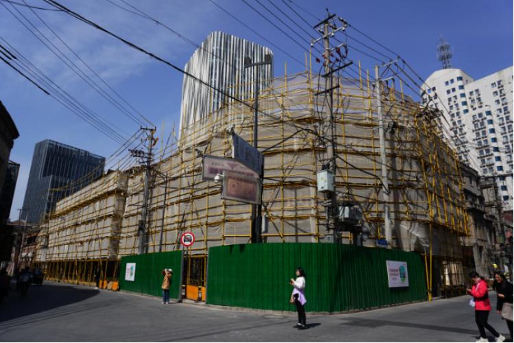 记者3月21日到现场时发现,在乍浦路一侧的建筑,已经重新搭建了脚手架,并竖起了围挡,大部分外景和店招都被遮挡。北海宁路一侧,一些工人师傅正在现场进行修缮工作,有工人师傅不断往外运被拆除的建筑材料,其中包括一些木板和木条。一位工人师傅告诉记者,完成这些修缮至少需要几个月的时间。
