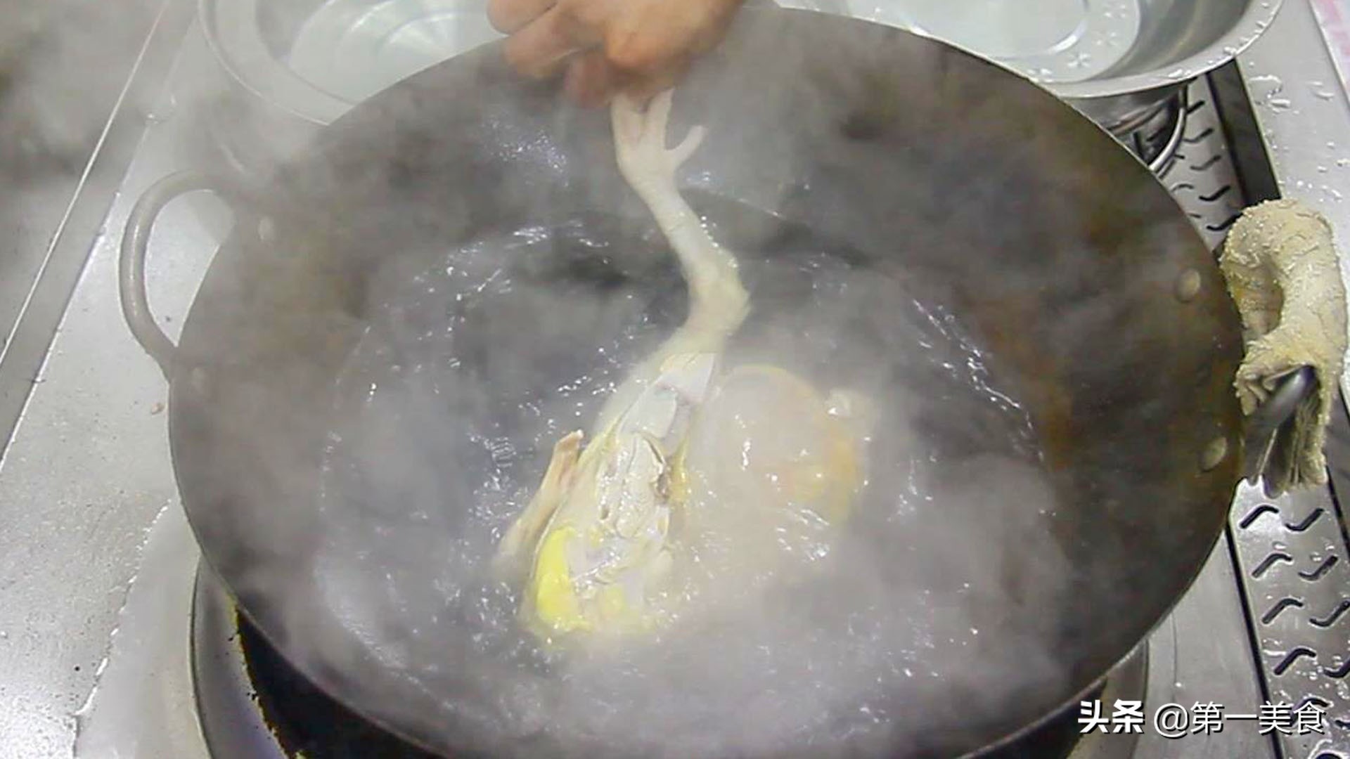 锅中烧水,再准备一盆凉水放一边备用,水烧开之后,把三黄鸡放入开水中浸泡5秒钟。