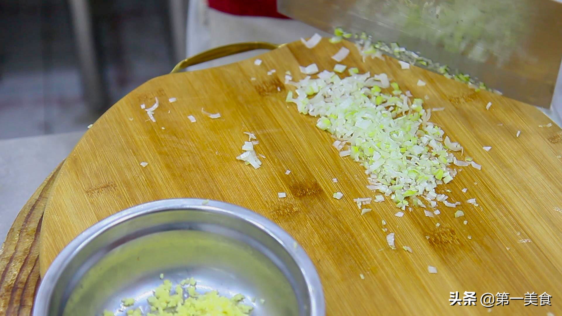在冷却的时间,我们准备一下蘸料,生姜一块,拍扁后,切成细沫,大葱白,也切成细沫,放在一起备用。