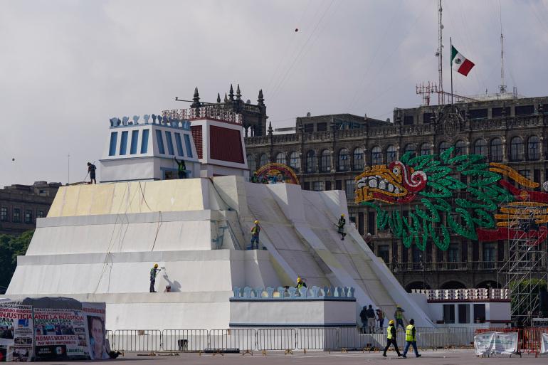 8月9日,墨西哥城,工人们建造阿兹特克大神庙仿制建筑,纪念“特诺奇蒂特兰城沦陷”500周年