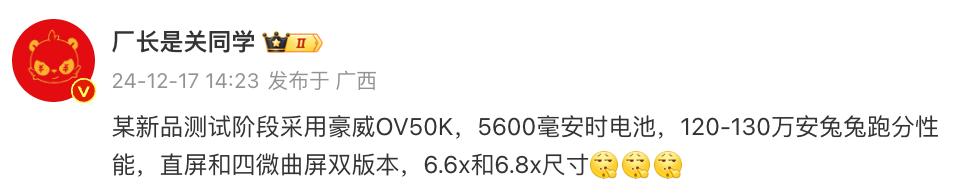 某新品测试阶段采用豪威OV50K,5600毫安时电池,120-130万安兔兔跑分性能,直屏和四微曲屏双版本,6.6x和6.8x尺寸。