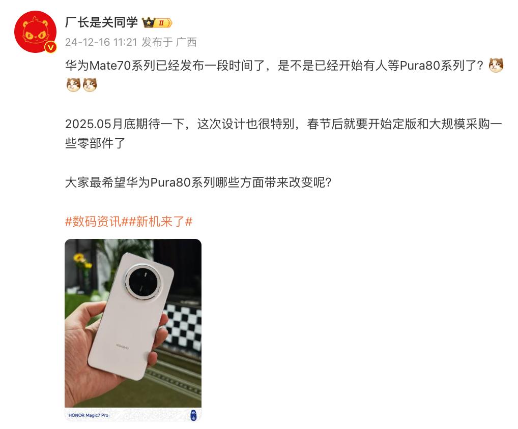 华为Mate70系列已经发布一段时间了,是不是已经开始有人等Pura80系列了?2025.05月底期待一下,这次设计也很特别,春节后就要开始定版和大规模采购一些零部件了