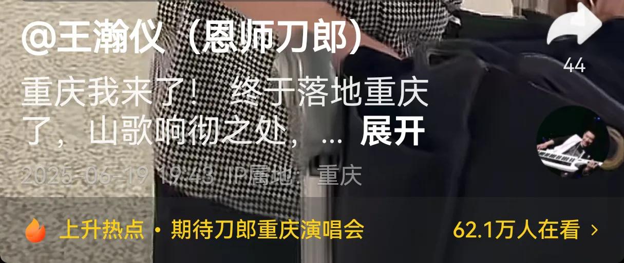 而6月19号当天,刀郎曾经的大徒弟王瀚仪在自己的个人社交账号发布动态,显示他本人也已经抵达了重庆。而这次来到重庆,很显然是为了给自己的老师演唱会捧场加油助威的。