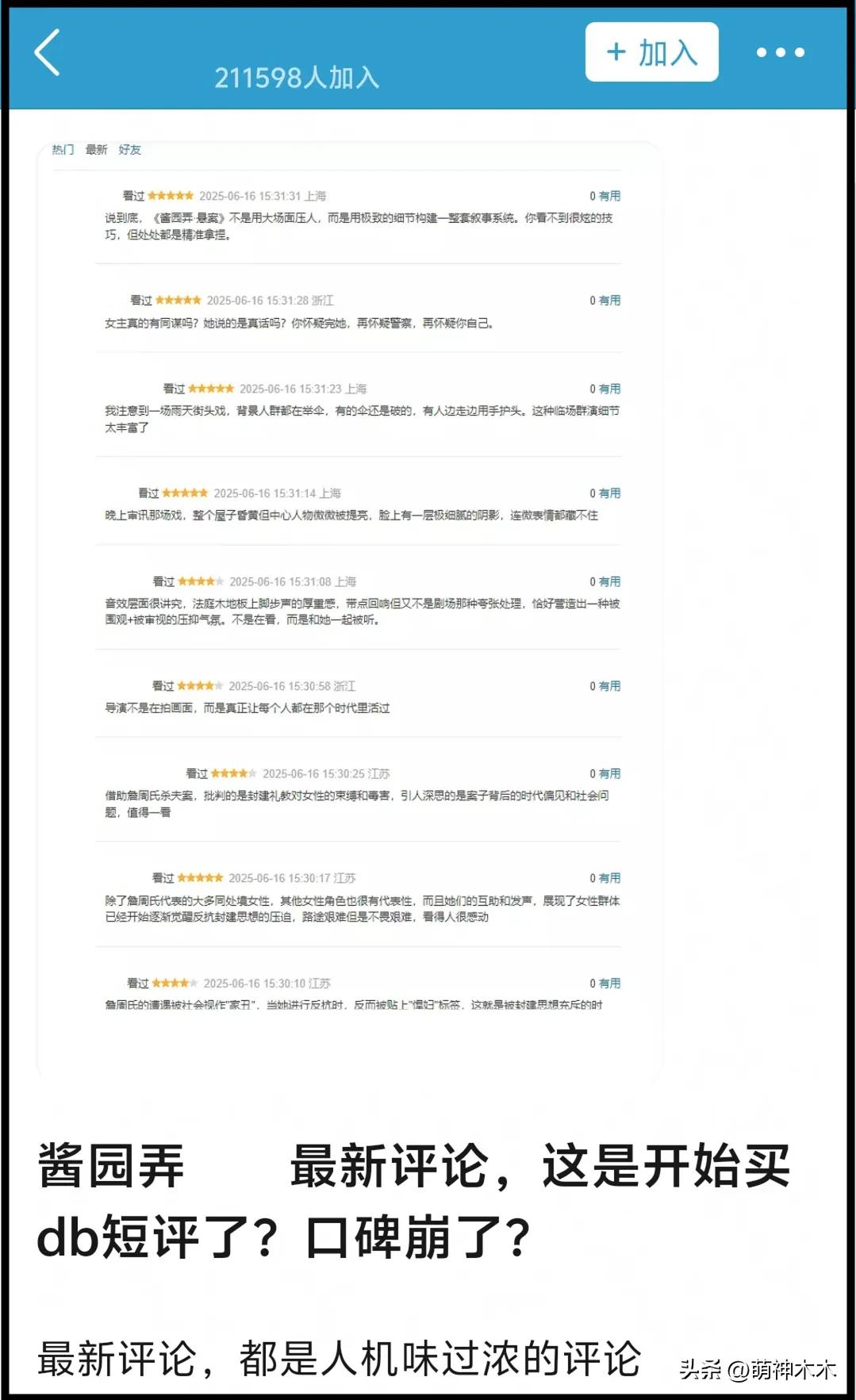 不止一位网友发现,自从《酱园弄》首映口碑不稳之后,背后总有人动作频频,从电影短评区突然空降大量人机好评到平台隐藏杨幂台词片段替换评论区,无一不是为了维护电影口碑。