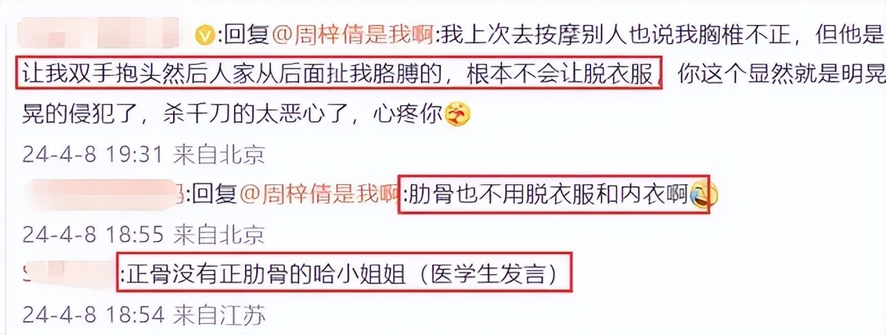 根据周梓倩的描述,在接受正骨治疗的过程中,男医师的行为严重超出了专业范畴,不当地触碰了她的隐私部位,侵犯了她的个人空间。这种露骨的性骚扰行为无疑对她造成了巨大的精神创伤和人格侮辱。