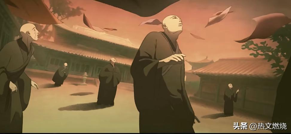 所以,这段动画最精彩的部分来了。只见金池将数量众多、华美无比的袈裟高高抛向空中,以供众人观赏。这里意味着斩断贪嗔痴,而金池自以为自己都已经放下了,然而画面却给到了金刚像。