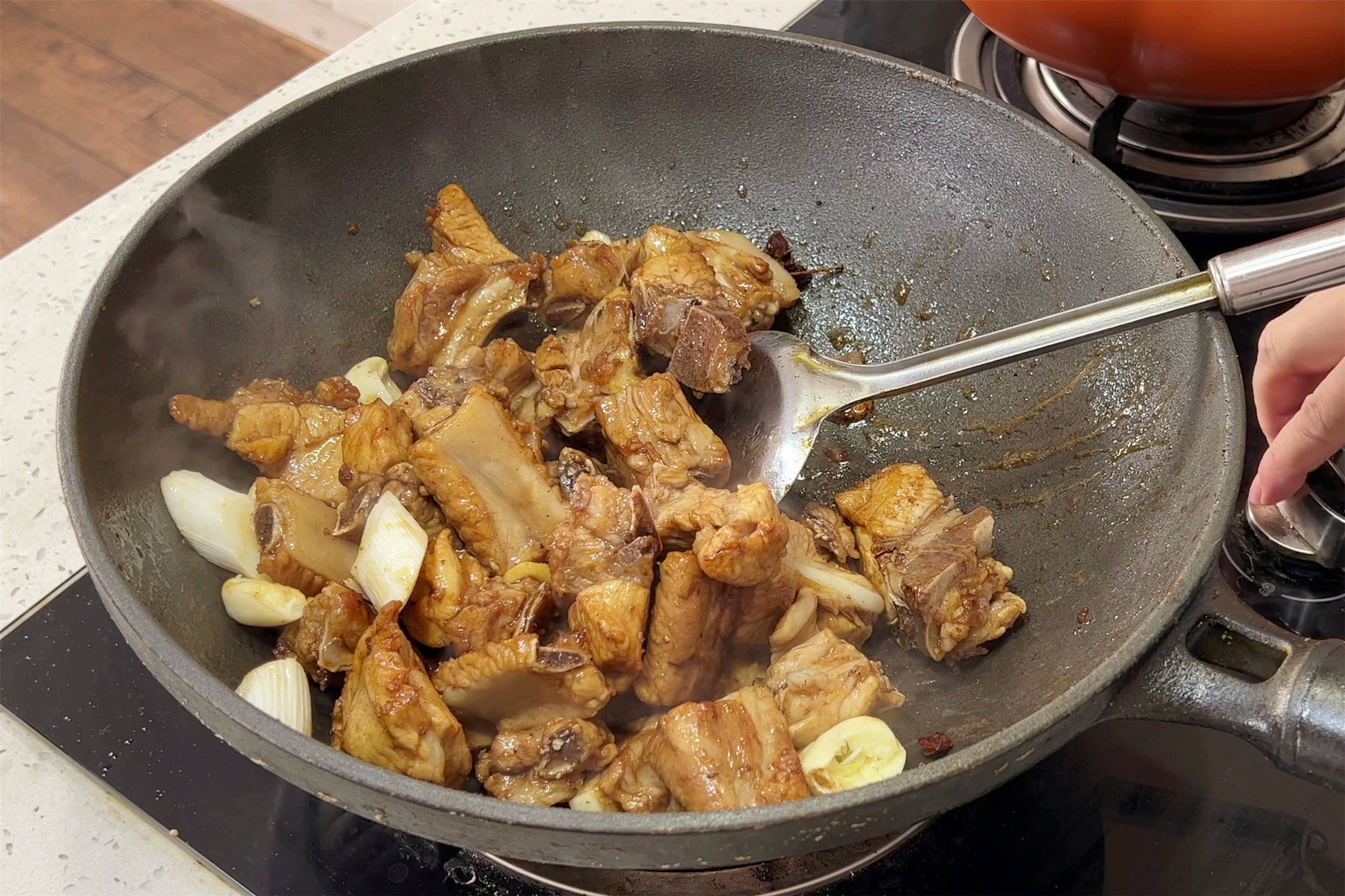 4、加入姜片、葱段、八角大火翻炒出香味。